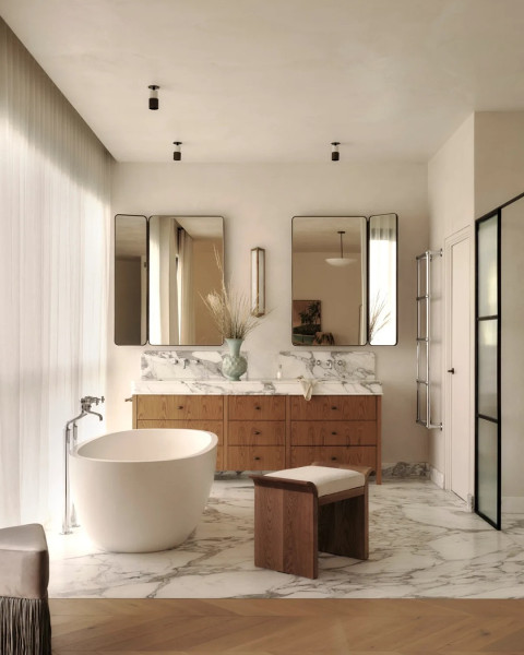 For those who enjoy a sense of richness without visual chaos, Neutral Maximalism is one of the standout trends for 2026. This approach blends the layered interest of maximalism with a restrained, neutral palette to create bathrooms that feel expressive but composed.