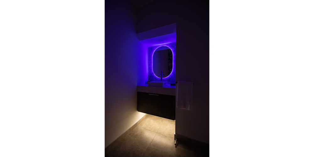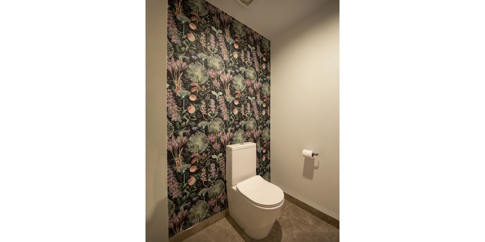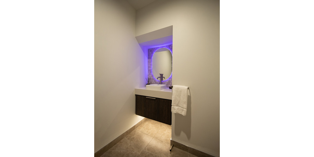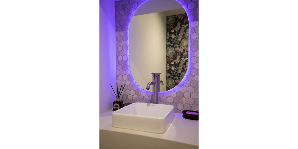 The downstairs powder room maintained many of the same features but received a touch of extra glamour with unique wallpaper and backlighting to the mirror.