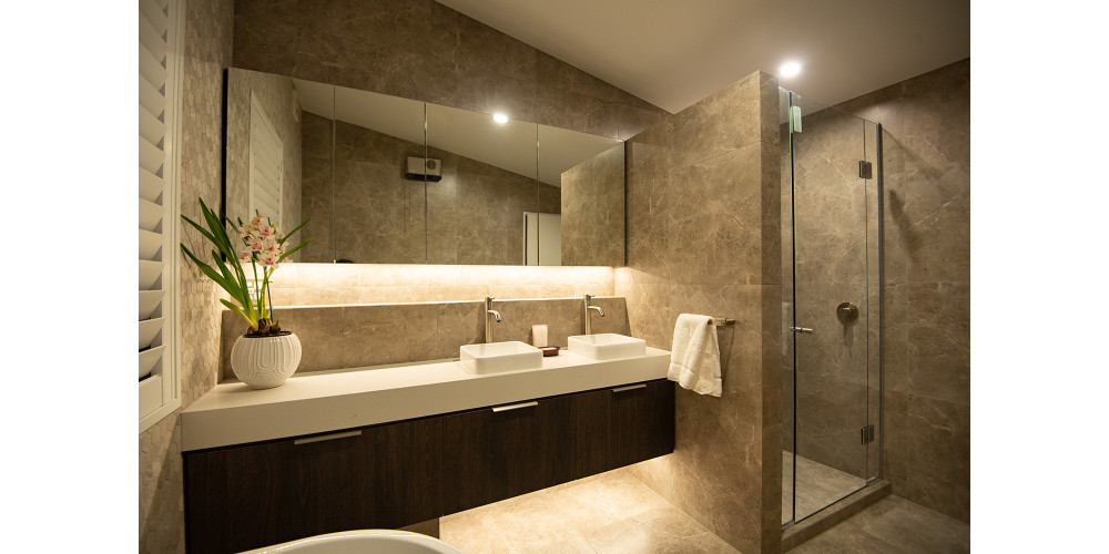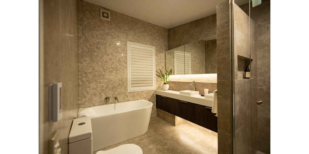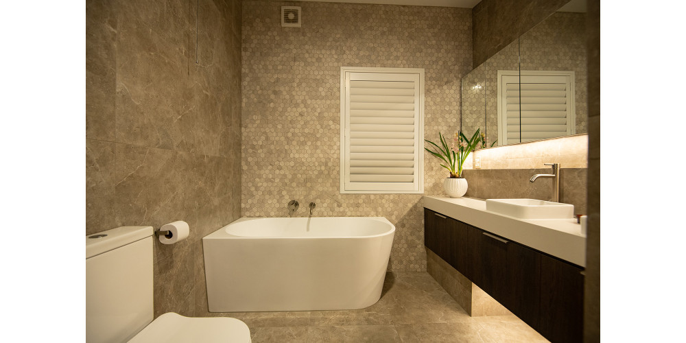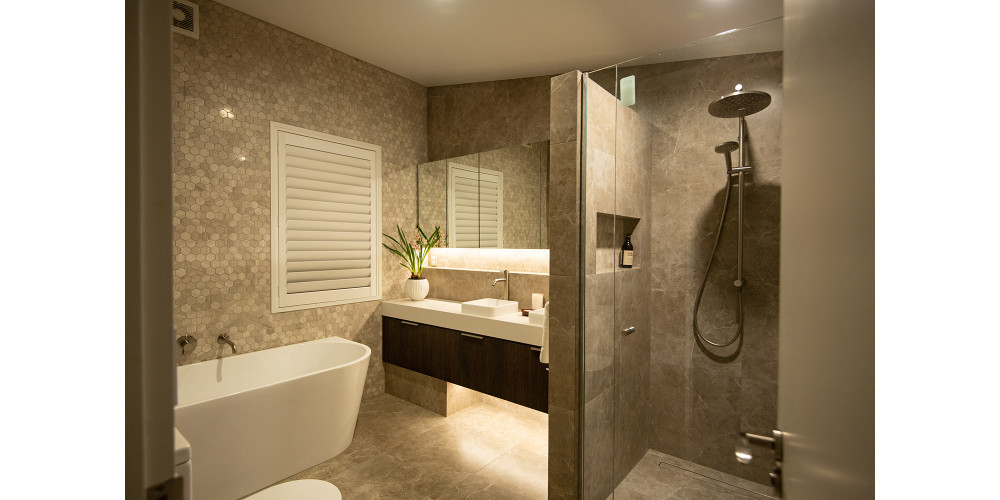 To achieve this the shower was placed in a private cubicle to one side. The 1500 Newark bath provides ample soaking room on the opposite side, without closing in the space. The custom vanity in dark oak provides a focal point, with Cube inset bowls and Uno brushed nickel tapware set to one side to provide plenty of bench space. A laundry shoot is discreetly built into the cabinetry.