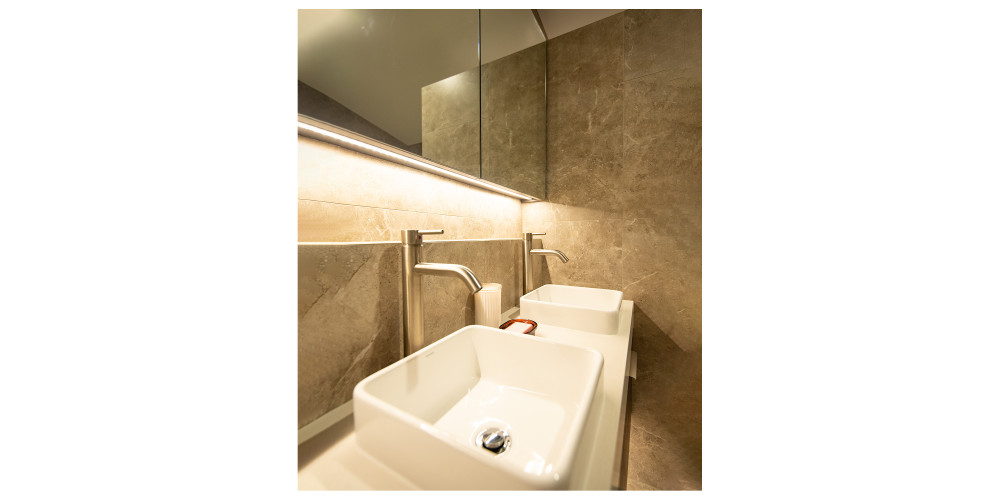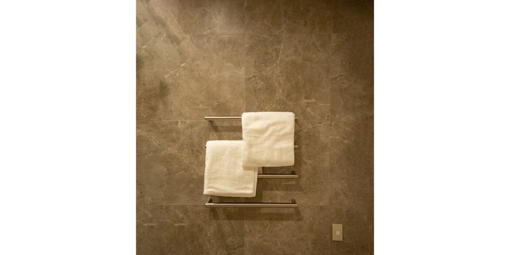The earthy tones of the tiles and clever lighting ensure a light, calming welcome to the room and a break away from the hustle and bustle of the city.