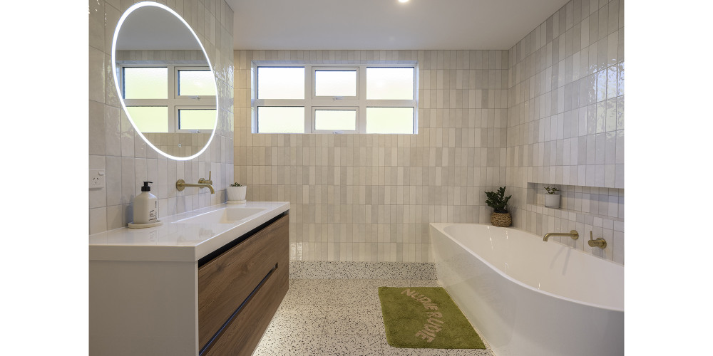 There are many considerations when designing a bathroom fit for a large family. The owners of this home have four young children and decided to limit potential mess and time spent cleaning with a wet room.