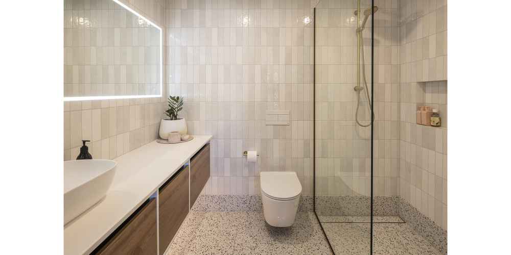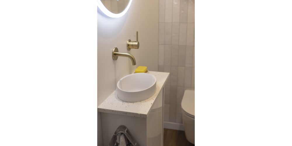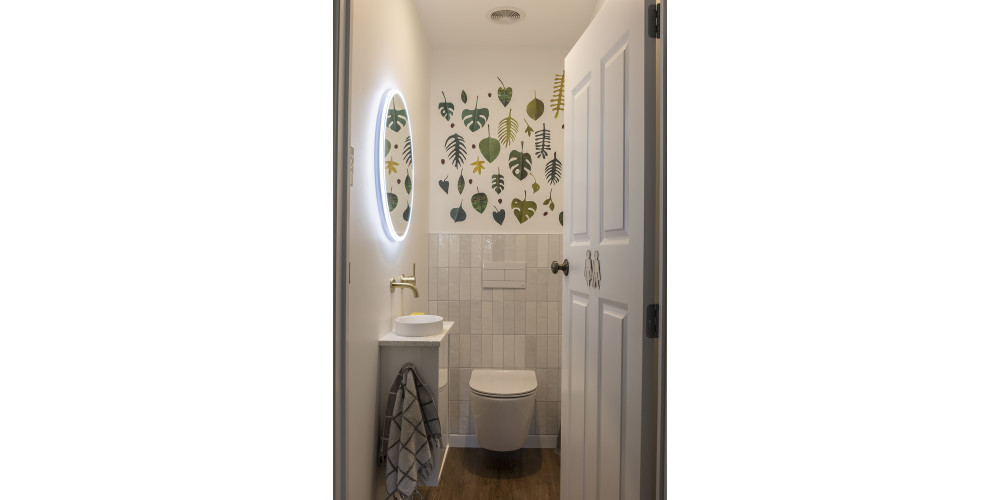 Left over tiles feature in the powder room alongside a London slimline vanity. It’s upmarket appeal suits the tiles and provides room for soaps or personal items with its overhang and concealed toilet roll holder.