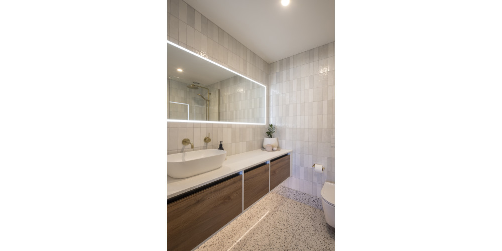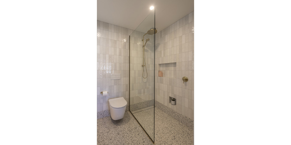 The large wet room features a centrally placed vanity. Either side are private smaller rooms, one for the toilet and one for the glassless shower cubicle. Custom strip drains blend effortlessly into the finished look.