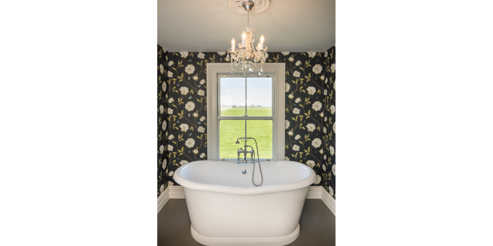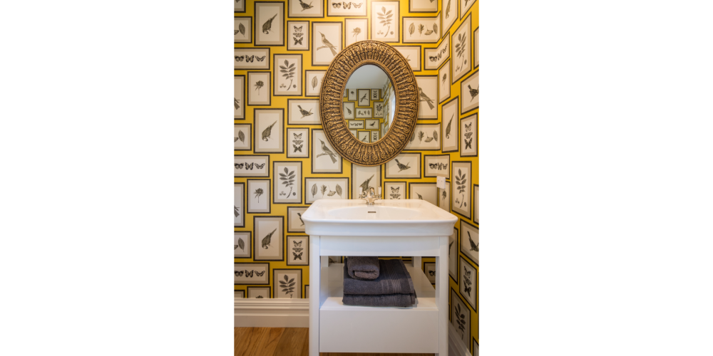 The downstairs guest bathroom features a Crest Lacunastone shower with frameless glass enclosure and a Michel Cesar vanity that pops against the bright buttercup wallpaper. Upstairs, the family bathroom features a pair of Burlington Edwardian pedestal basins that complement the curvaceous Burlington bath, where one can enjoy the bucolic views out across the neighbouring farms.