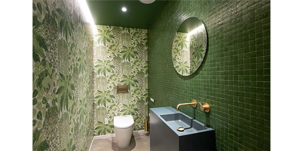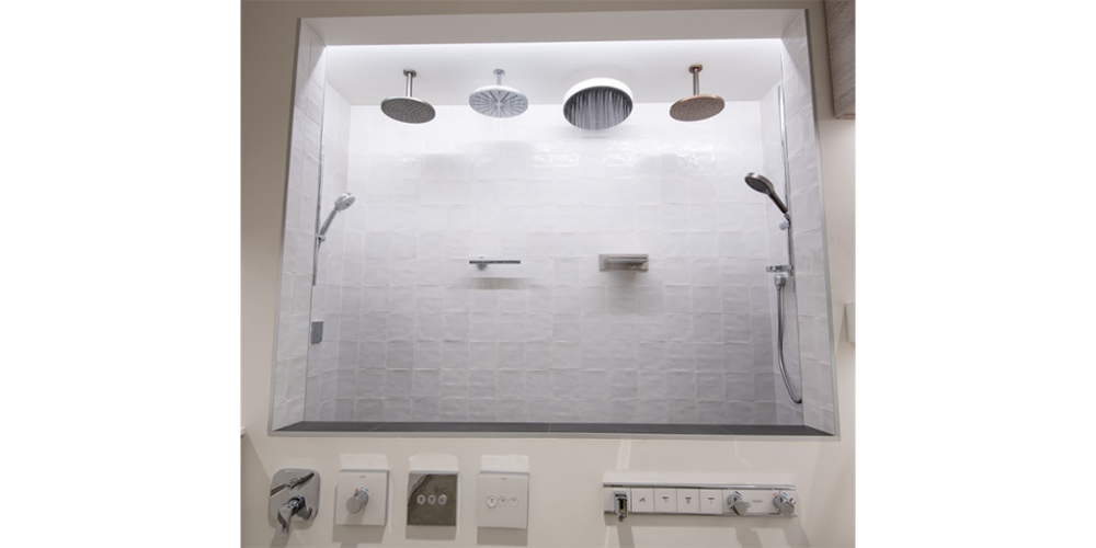 Peter Tilley Plumbing & Drainlaying completed the plumbing and bathrooms. This included the ladies powder room, with Axent intelligent toilet, brushed brass Buddy tapware and a Concrete Nation freestanding washbasin in Deep Ocean, all from Plumbline; and the wet area with state-of-the-art Hansgrohe technology running the many working displays.