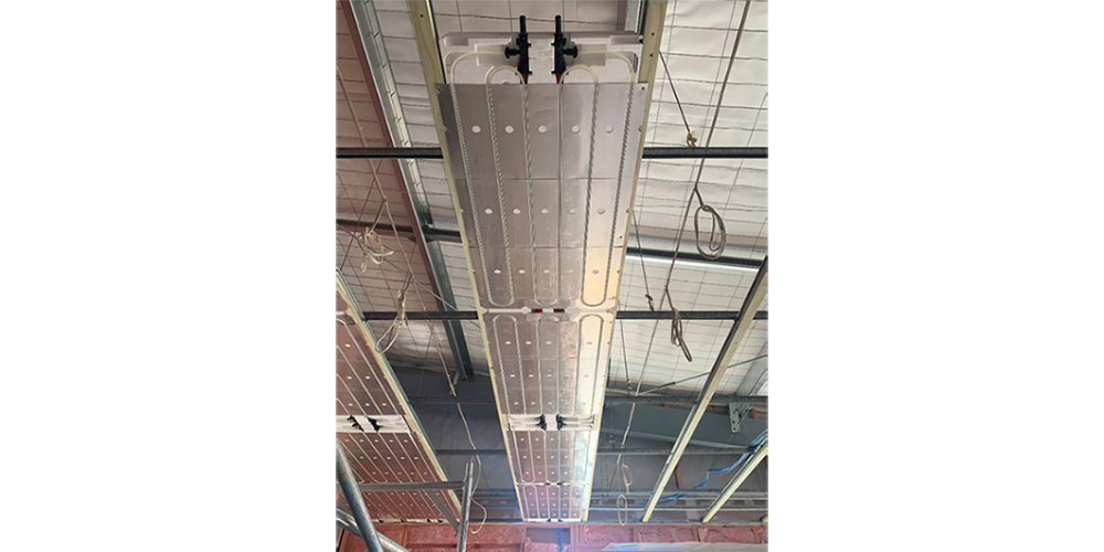 Upstairs the offices are temperature-controlled with an in-ceiling system from Tim Miller Plumbing. Like underfloor heating the in-ceiling panels have hot water piped through them in winter and cold water in summer to provide consistent temperatures.
